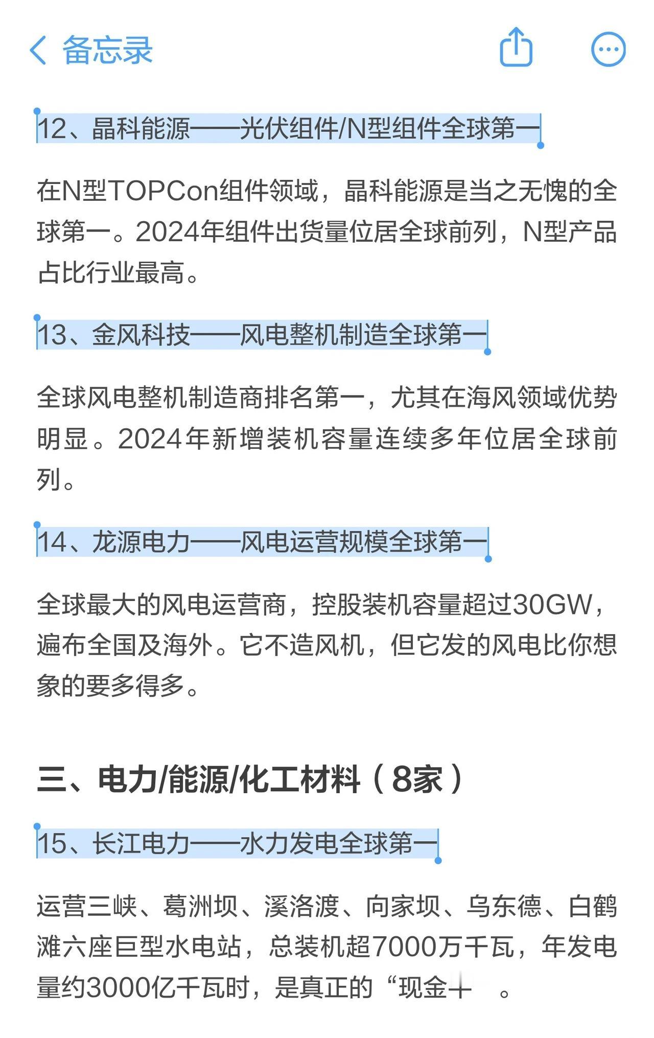 2. 光伏风电产业链(6家):隆基绿能(光伏组件+单晶硅片)、通威股份(光伏硅料+电池片)、阳光电源(光伏逆变器)、晶科能源(光伏组件/N型组件)、金风科技(风电整机制造)、龙源电力(风电运营规模),覆盖光伏上下游、风电制造与运营,在单晶硅片、逆变器、整机、运营规模等领域全球市占率/出货量/装机量第一。