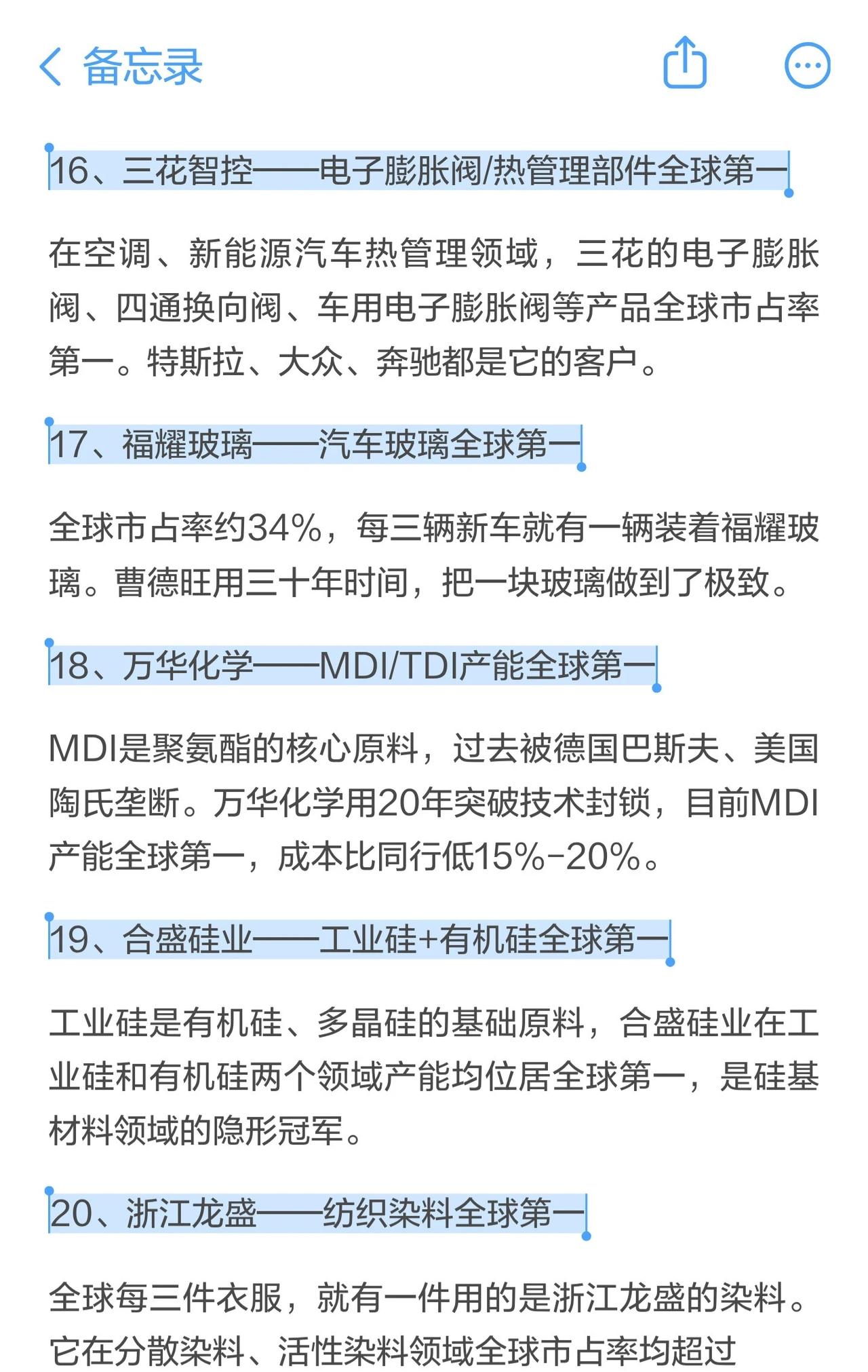 3. 电力/能源/化工材料(8家):长江电力(水力发电)、三花智控(电子膨胀阀/热管理部件)、福耀玻璃(汽车玻璃)、万华化学(MDI/TDI产能)、合盛硅业(工业硅+有机硅)、浙江龙盛(纺织染料)、中国巨石(玻璃纤维)、北方稀土(稀土原料产能),在水电运营、热管理、汽车玻璃、化工原料、染料、玻璃纤维、稀土等领域全球产能/市占率第一,技术或规模壁垒突出。