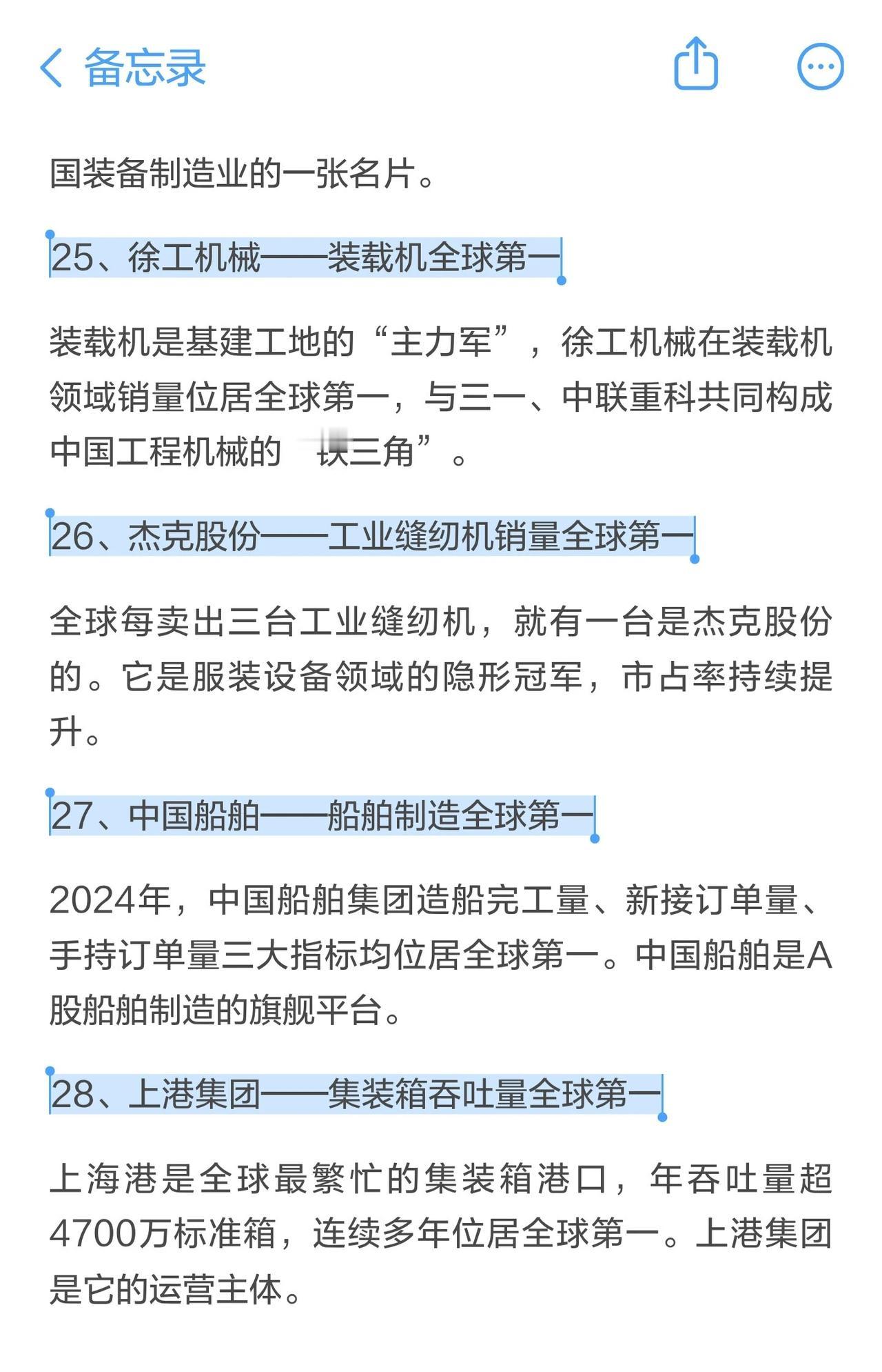 4. 高端制造/装备(6家):中国中车(高铁装备制造)、三一重工(挖掘机+混凝土机械)、徐工机械(装载机)、杰克股份(工业缝纫机)、中国船舶(船舶制造)、上港集团(集装箱吞吐量),在高铁、工程机械、船舶、港口运营等领域全球市场份额/销量/吞吐量第一,是中国高端制造的标杆。