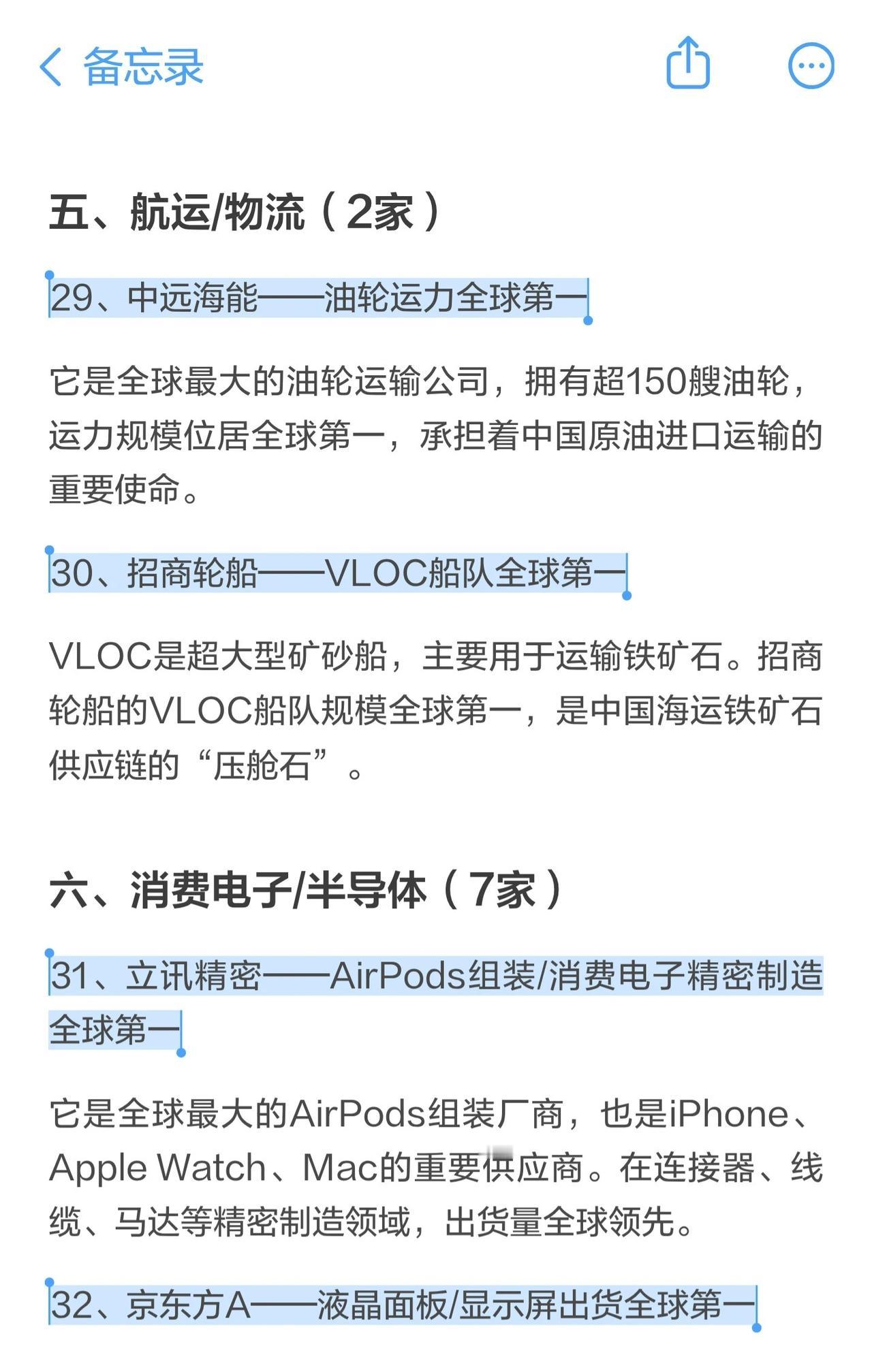5. 航运/物流(2家):中远海能(油轮运力)、招商轮船(VLOC船队),在全球油轮运输、超大型矿砂船(VLOC)船队规模上位居第一,保障能源/资源运输。