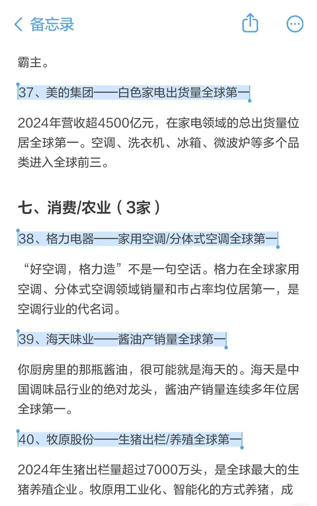 7. 消费/农业(3家):格力电器(家用空调/分体式空调)、海天味业(酱油产销量)、牧原股份(生猪出栏/养殖),在空调、酱油、生猪养殖领域全球销量/市占率第一,是行业绝对龙头。