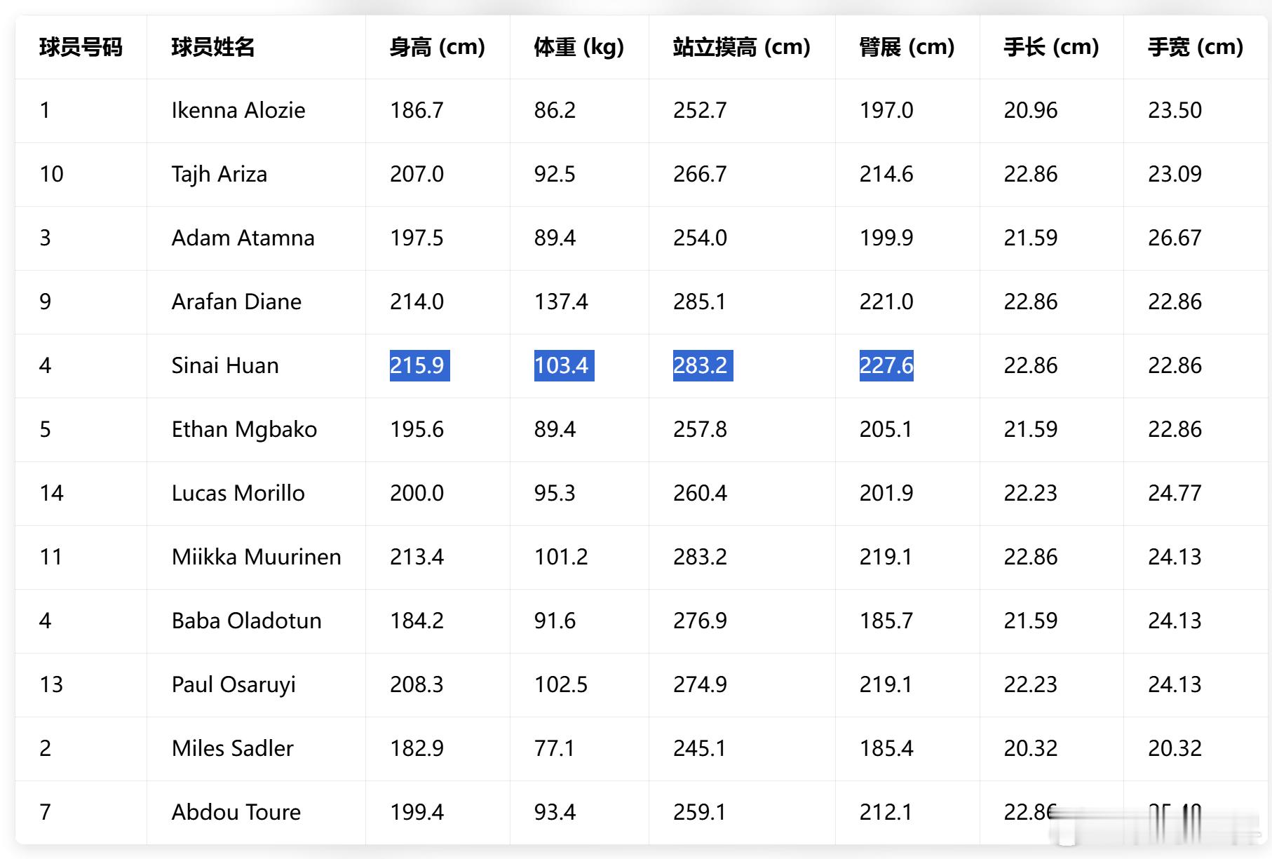 郇斯楠在nike峰会上的体测数据,身高215.9公分、臂展227.6公分,站立摸高283.2公分。臂展和大家猜了很多年的230差一点点,+12的水平。对比一下杨瀚森是身高216、臂展220、站立摸高282。