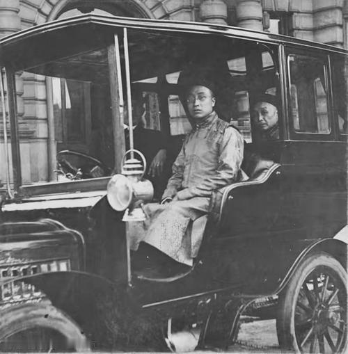 爱新觉罗·溥伦是清末宗室中思想最开明、最早系统接触西方文明的核心人物之一。照片中汽车前排的他头戴瓜皮小帽,身着中式立领长袍,佩戴金丝眼镜,神态严肃威仪。后排的人为溥伦的随员、翻译或侍从,全程陪同使团访美。