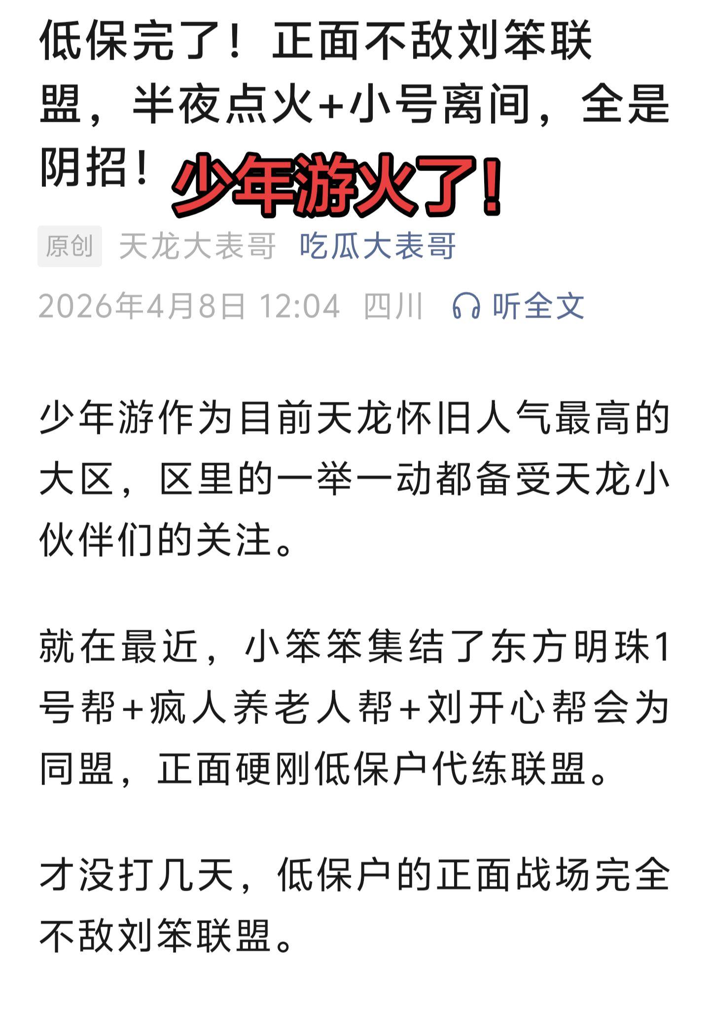 少年游,目前看到了希望,低保户从开区统治这个区所有的资源,即将被瓦解,大家拭目以待~天龙八部怀旧服