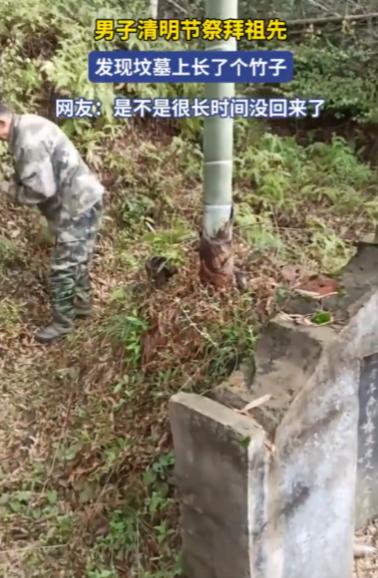 江西,一男子清明上山祭祖,结果到了地方,却发现祖先的坟上竟然长了一根竹子,而且不偏不倚的长在了坟头正中间,网友:这是不是很长时间没回来了?