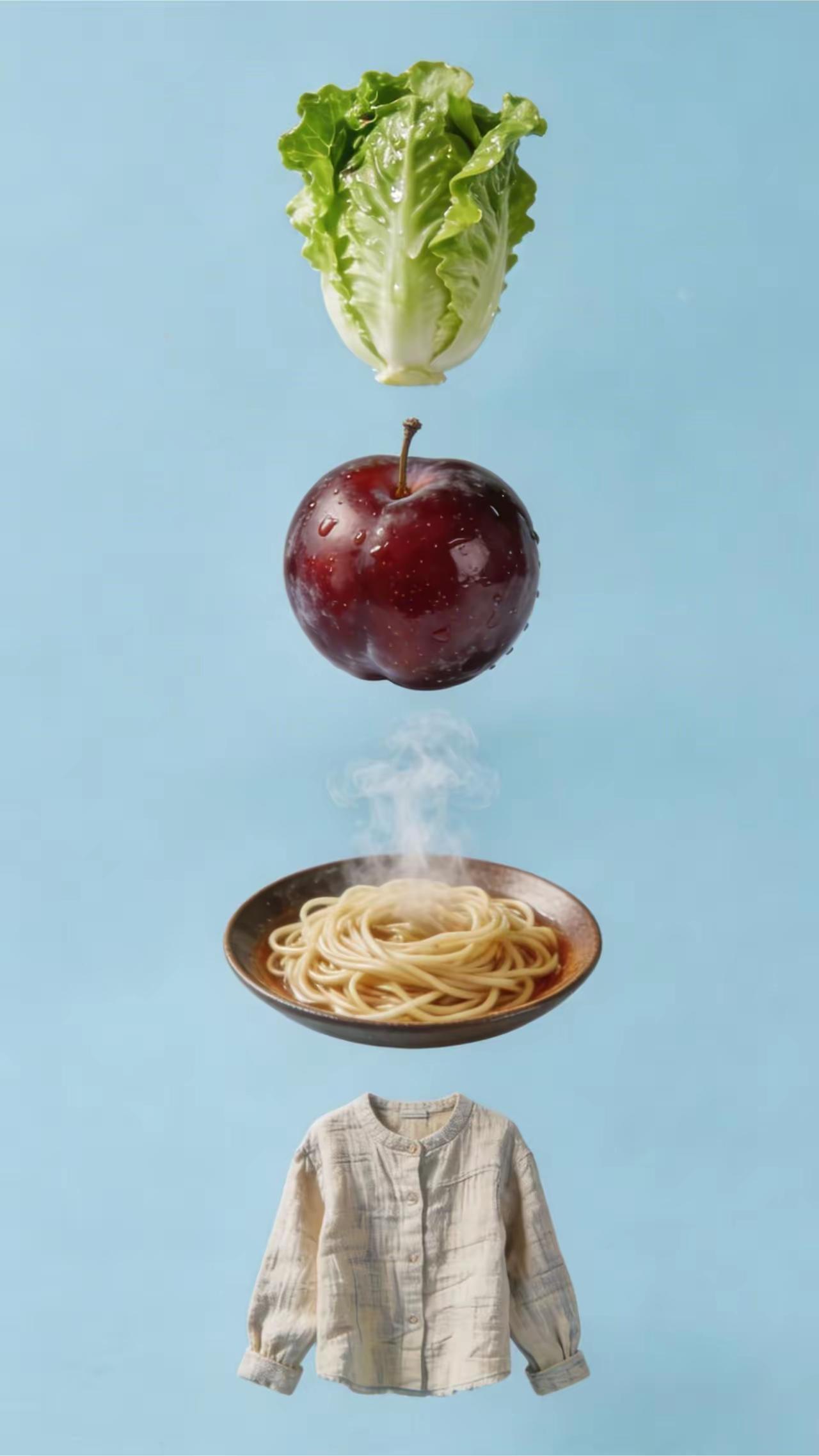 不给提示 没有一个文字 只有四样吃和穿 白菜 李子果 还有碗刚煮熟的面条 最后是