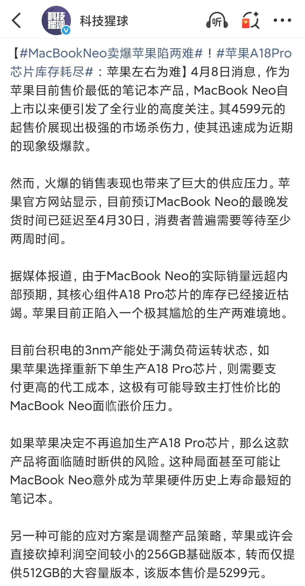 苹果4599元起售的MacBook Neo销量超预期,官网发货延至4月30日,核心A18 Pro芯片库存或将耗尽。该机采用5核GPU版芯片,成本极低,如今台积电3nm产能满载,苹果追加订单将推高成本、面临涨价;不补单则可能断供,甚至成为史上最短命Mac。苹果或砍256GB版、仅售5299元512GB机型,消费者购机成本将上升。