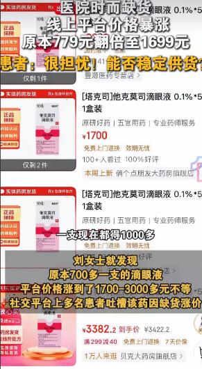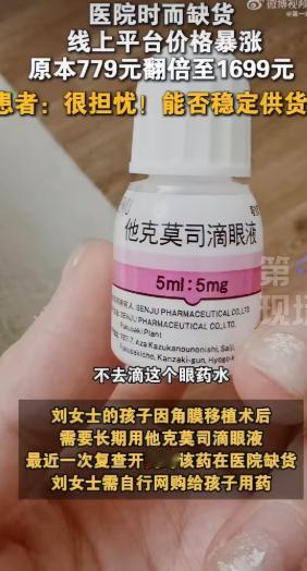 其实,遭遇这种困境的不止这一个广东家庭。最近一段时间,全国多地都有角膜移植术后患者反映,他克莫司滴眼液出现缺货情况,线上线下价格暴涨,无数依赖这款药物的患者,陷入了“用不起、停不得”的绝境。