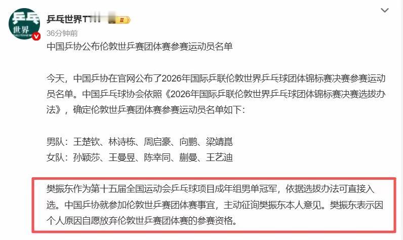 不是吧,樊振东真的不回来,王楚钦首次领军