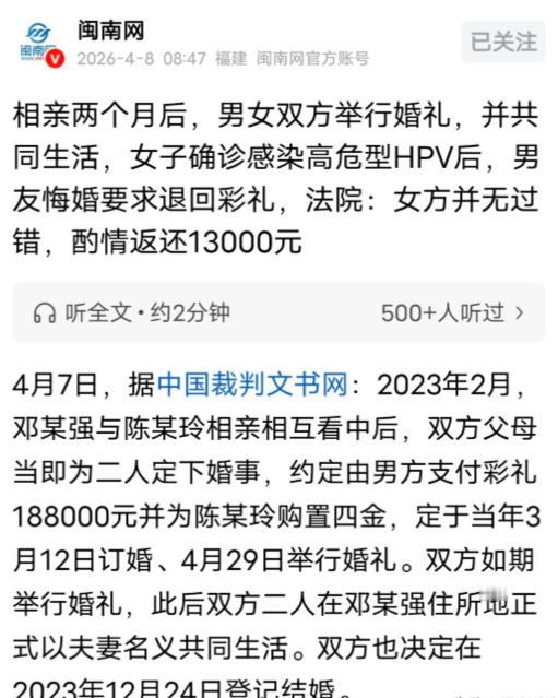 “不婚检的下场!”女子和男子相亲2个月,收了188000彩礼、四金,办了婚礼,同居生活,女子查出高危型HPV,男友怀疑女子有问题,对她变冷淡,甚至动手打她,拒绝领结婚证,直接悔婚,将女子告上法院,要求退还彩礼以及四金。法院判决让人唏嘘。