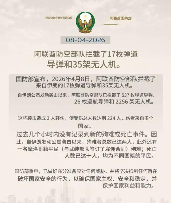 阿联酋国防部当晚发布的官方声明证实,其防空系统全程处于最高戒备状态,成功拦截了来自伊朗方向的17枚弹道导弹和35架自杀式无人机。声明同时公布,自美以伊冲突爆发以来,阿联酋防空系统已累计拦截537枚弹道导弹、26枚巡航导弹以及2256架无人机。