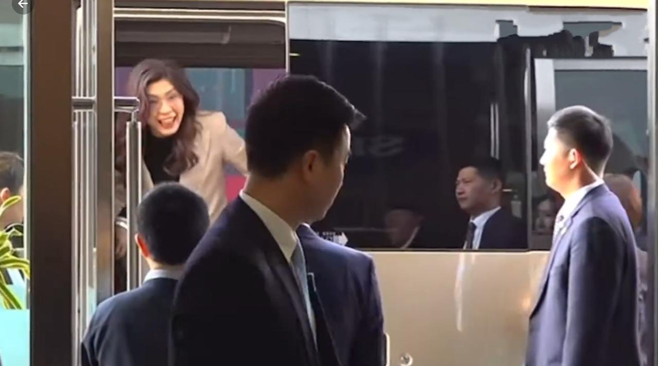 来到洋山港参观,心情看起来也是相当不错,还笑着和大家比了个OK的手势打招呼,相当有活力。