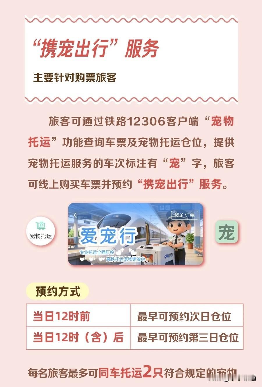 4月8日起高铁宠物托运升级 121站228趟列车可办理 在前期试行基础上,铁路正式推出“爱宠行”服务(面向非购票旅客,托运前2–5天通过“中铁快运”微信小程序预约,每趟列车最多托运1只),支持旅客携宠同行及宠物单独托运,进一步便利携宠出行。