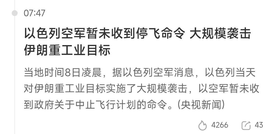 以色列这种出尔反尔,前一秒还对外宣称愿意配合停火,后一秒就手握屠刀,对伊朗的基础设施痛下杀手的做法,实在令人不齿。
