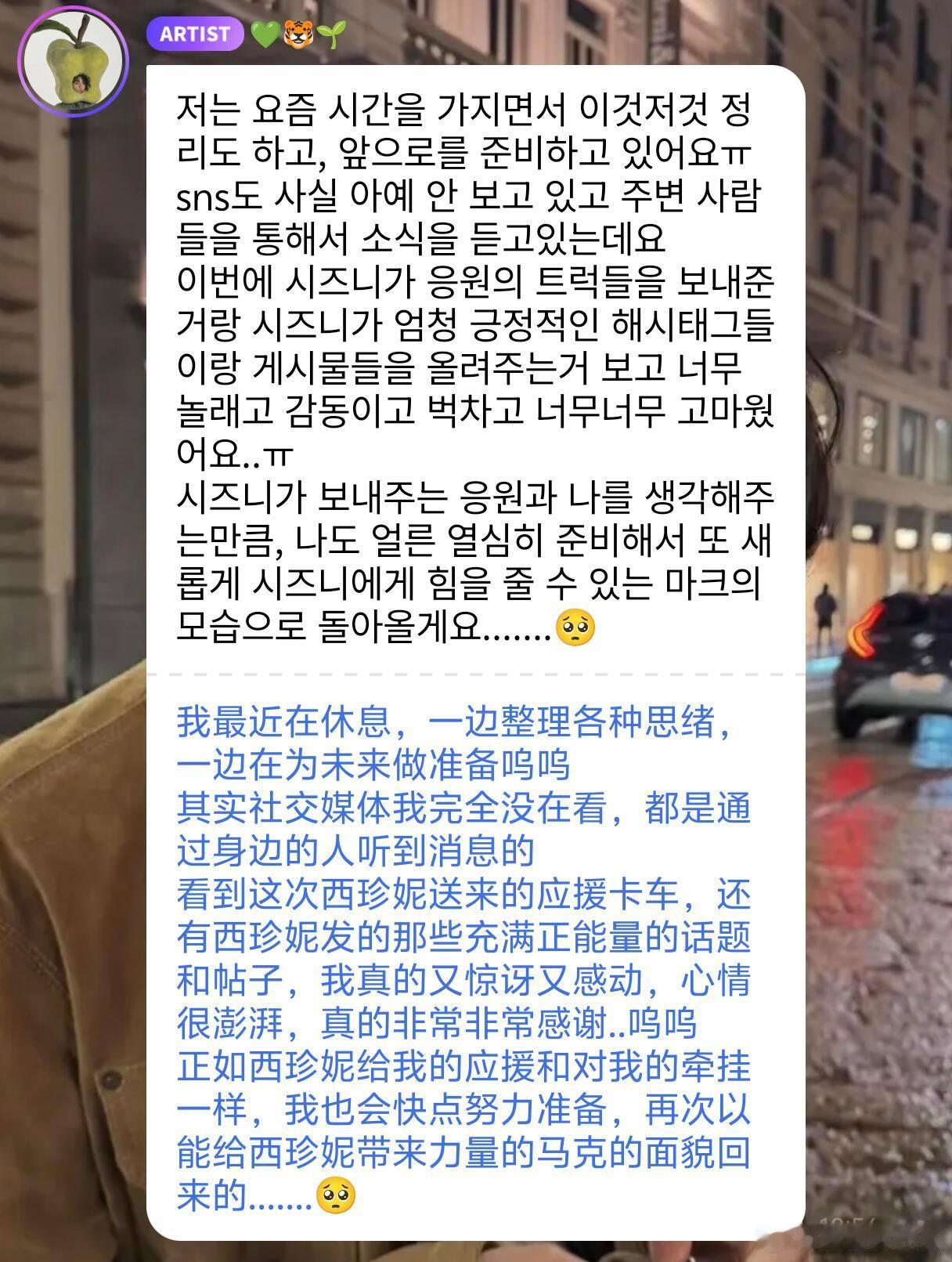 李马克再次道歉李马克泡泡再次道歉,同时也感谢了西珍妮为他做的一切,最近一边休息一边在为未来做准备,希望再次以能够给西珍妮带来力量的马克的面貌回归,最后真心祝贺NCT出道十周年。