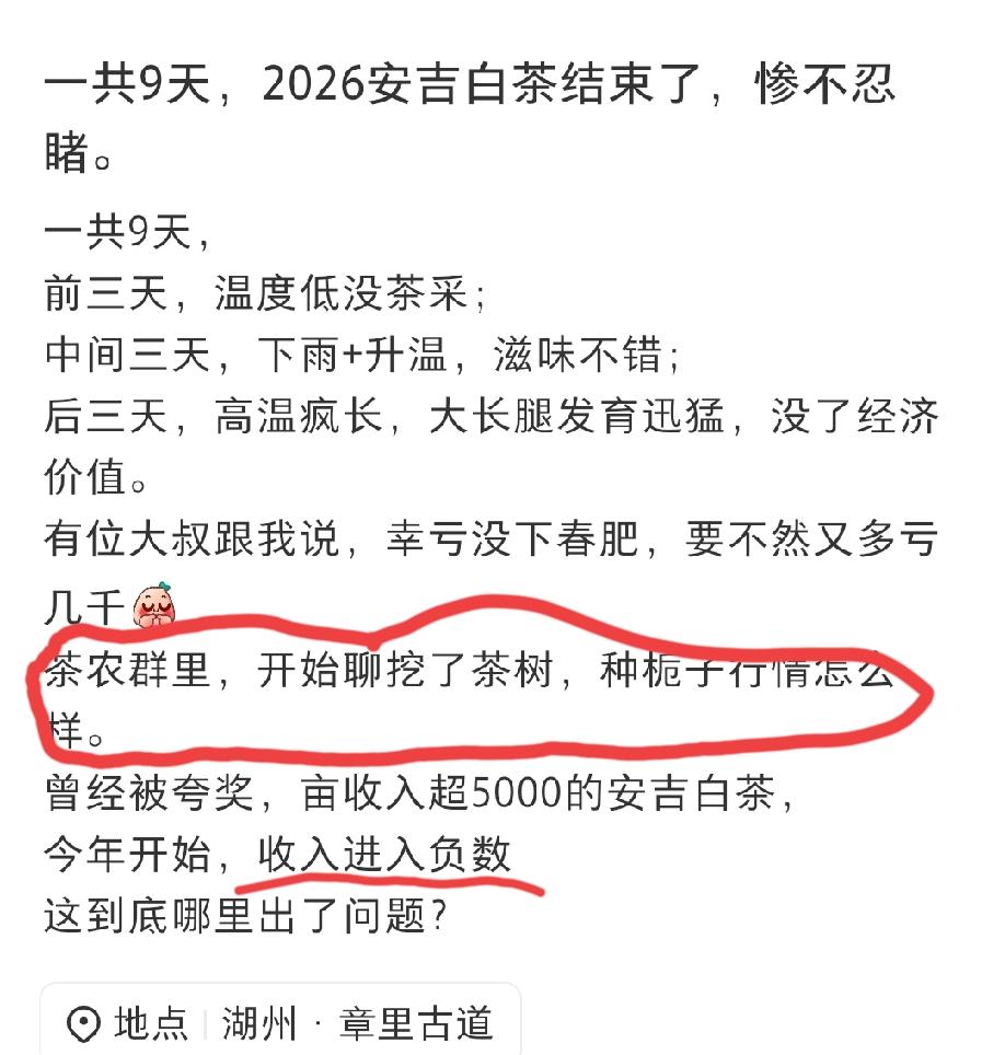 这位业内人士表示称:今天的安吉白茶上市季仅仅维持了9天,很多茶农已经在谈论应不应该把茶树砍了,去种更加有利可图的栀子树了,因为今天的收入是负数!!!