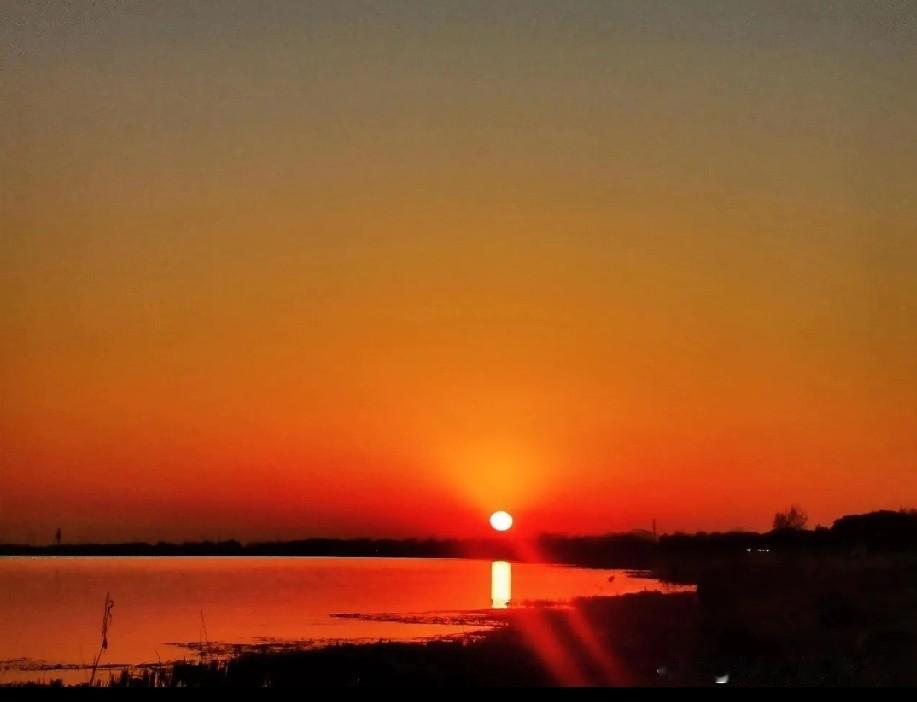太阳慢慢往西边沉下去,不再是白天刺眼的模样,变成了一颗圆滚滚的橘色火球,悬在水面上方,温柔得不像话。