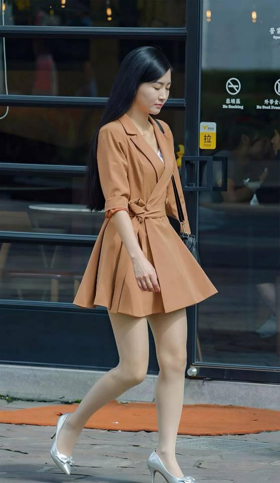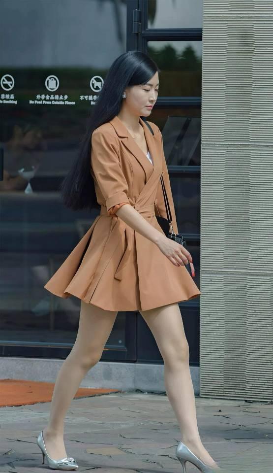 一头黑长直发柔顺披肩,衬得气质温婉又大气,完全是行走的氛围感女主。上身这件焦糖色西装裙亮眼:西装翻领显得利落干练, V领设计悄悄修饰脸型,拉长颈线,七分袖卷边设计多了几分随性松弛,腰间同色系腰带一系,瞬间掐出纤细腰线,A字大裙摆灵动飘逸,走路带风的样子,把轻熟女性的优雅与灵动展现得淋漓尽致。