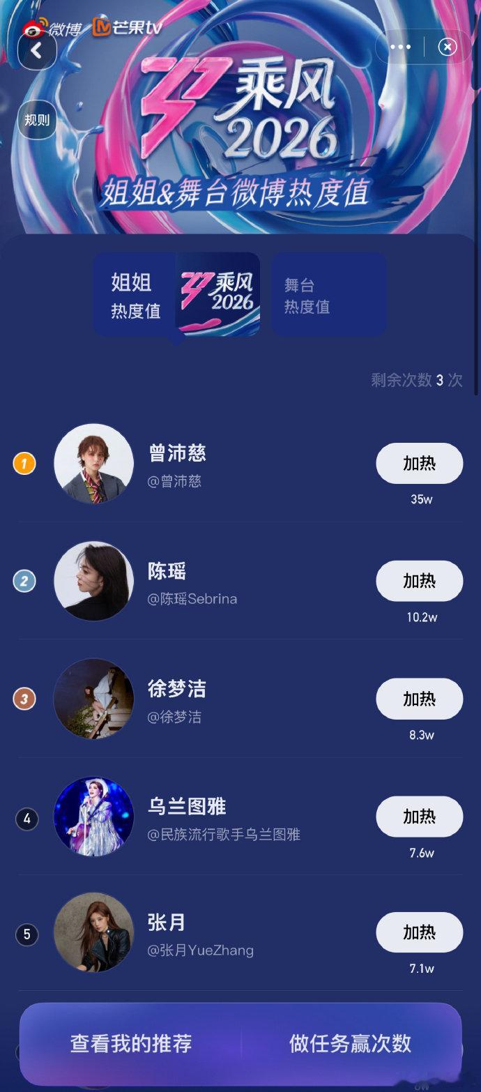 曾沛慈陈瑶徐梦洁乘风热度值前三曾沛慈乘风热度值稳居第一《乘风2026》热度值前三