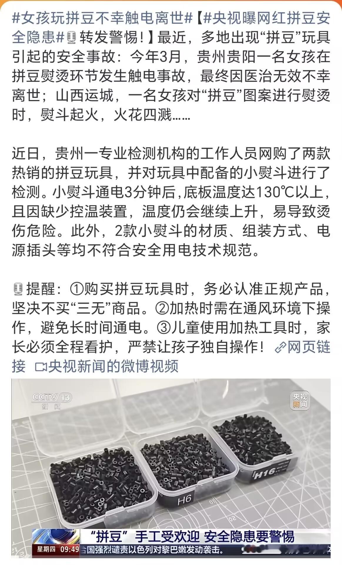 真被拼豆配套的三无迷你熨斗吓到了,没温控还直连220V电,三无电器千万别碰,给孩子的玩具可得注意安全女孩玩拼豆不幸触电离世
