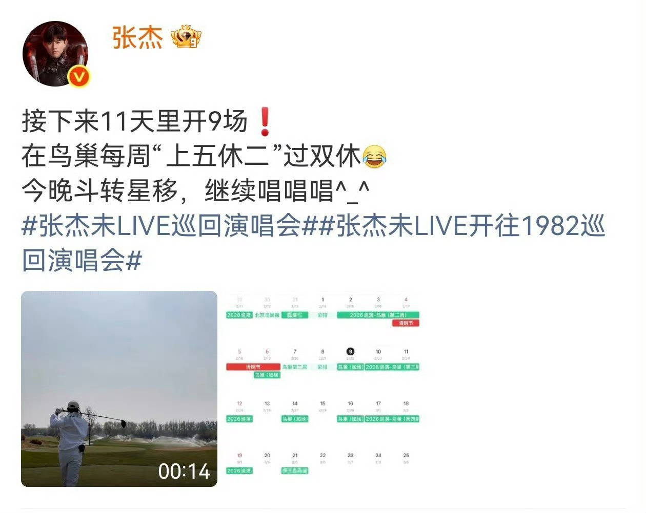 张杰在鸟巢过上双休了张杰演唱会上五休二别人去鸟巢打卡,杰哥直接在鸟巢过上上五休二!一周连开五场演唱会,这体力也太牛了吧!!期待今晚杰哥霸气开麦~~