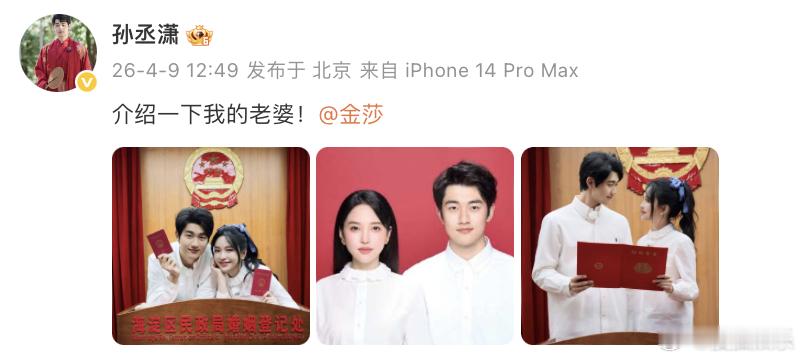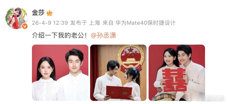今日,金莎、孙丞潇在《妻子的浪漫旅行》透露即将领证后,二人一同晒出结婚证正式公布