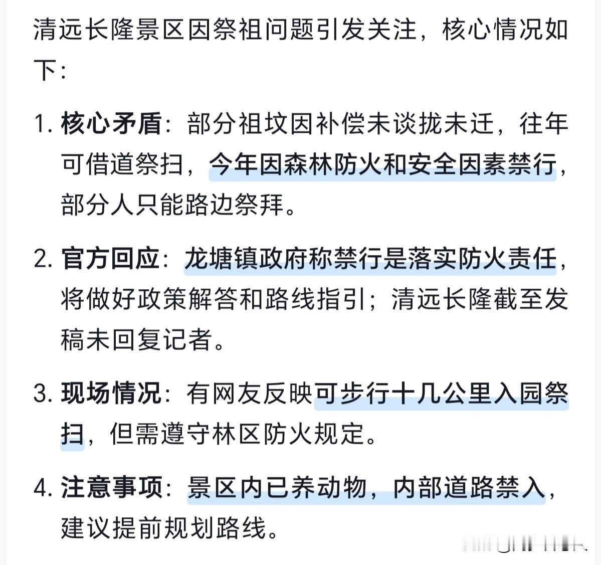 不让借道祭祖的原因,因为景区在园区内养了动物,自然不会再让事主家人像往年一样开着汽车行驶在景区内部道路借道扫墓。