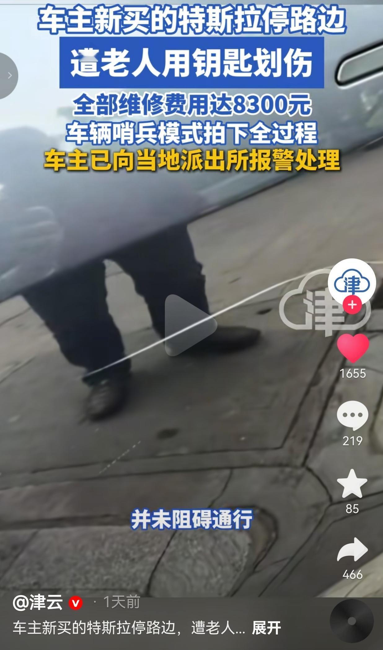 万幸的是,特斯拉开了哨兵模式,完整拍下了全过程!监控里清清楚楚:一个穿黑外套、拎着菜的老人,慢悠悠走到车边,掏出钥匙,从车头一路划到车尾,动作行云流水,一看就是故意的!