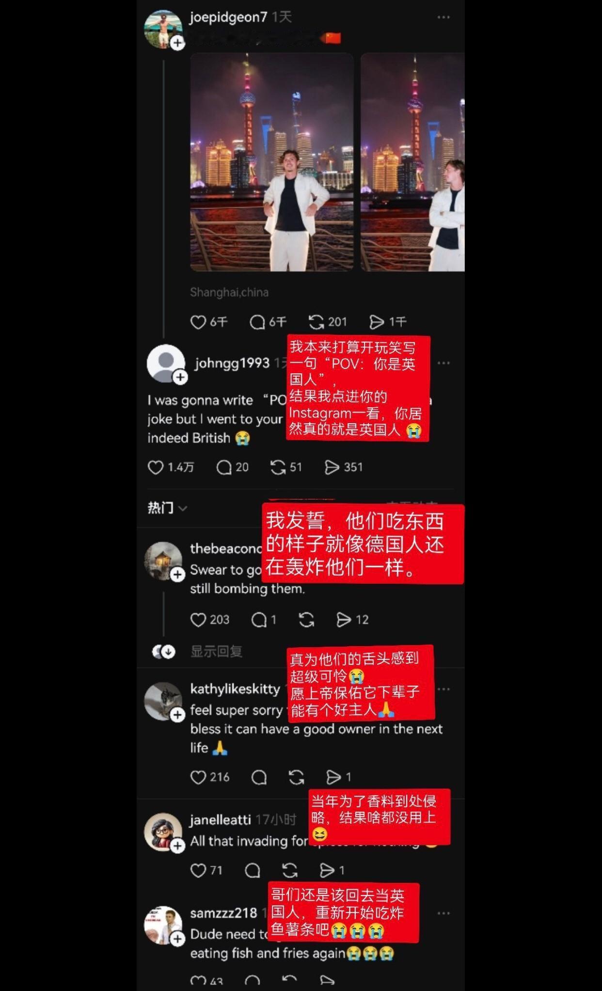 那个在脆上说“上海东西难吃”的英国人已经火了,评论区全是嘲笑他的外国人