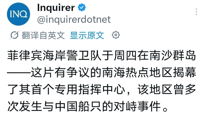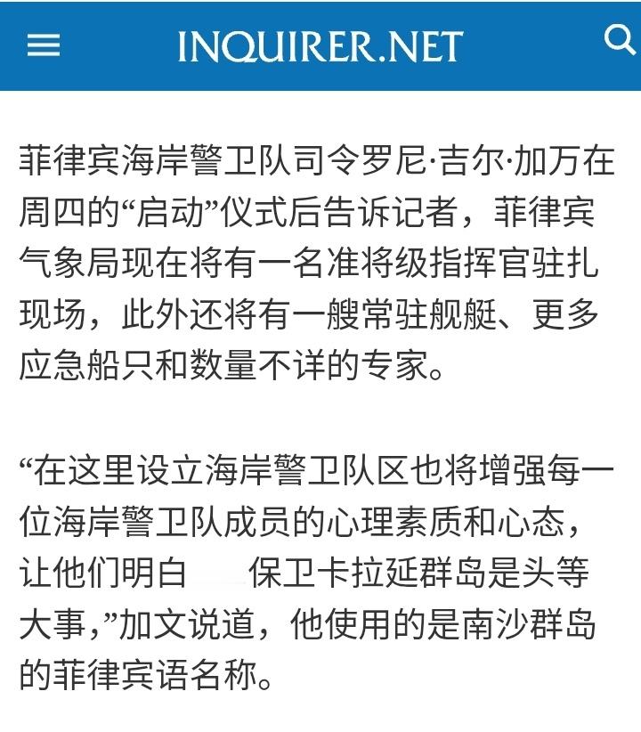 菲律宾媒体:今天(9日),菲律宾海岸警卫队在中业岛启用了其首个专用指挥中心。菲律宾海岸警卫队司令罗尼·吉尔·加万在启动仪式后告诉记者,菲律宾将有一名准将级指挥官驻扎现场,此外还将有一艘常驻舰艇、更多应急船只和数量不详的专家。