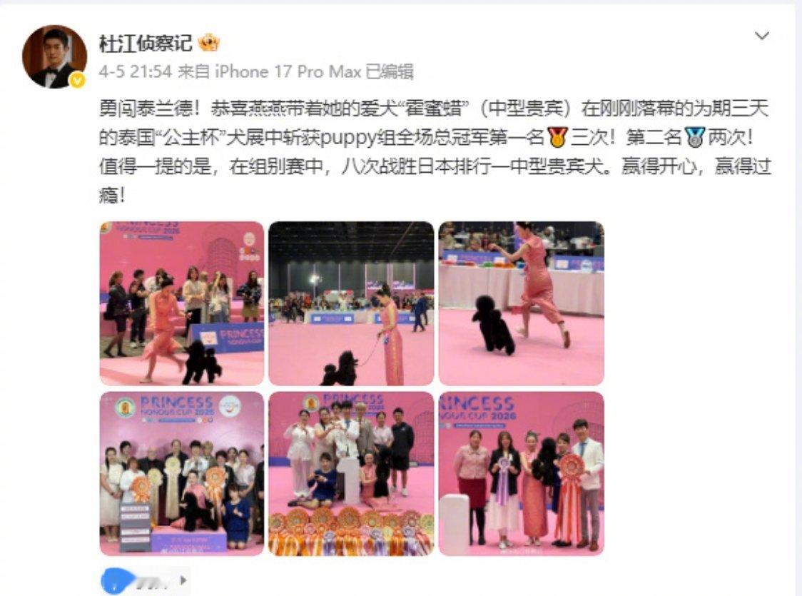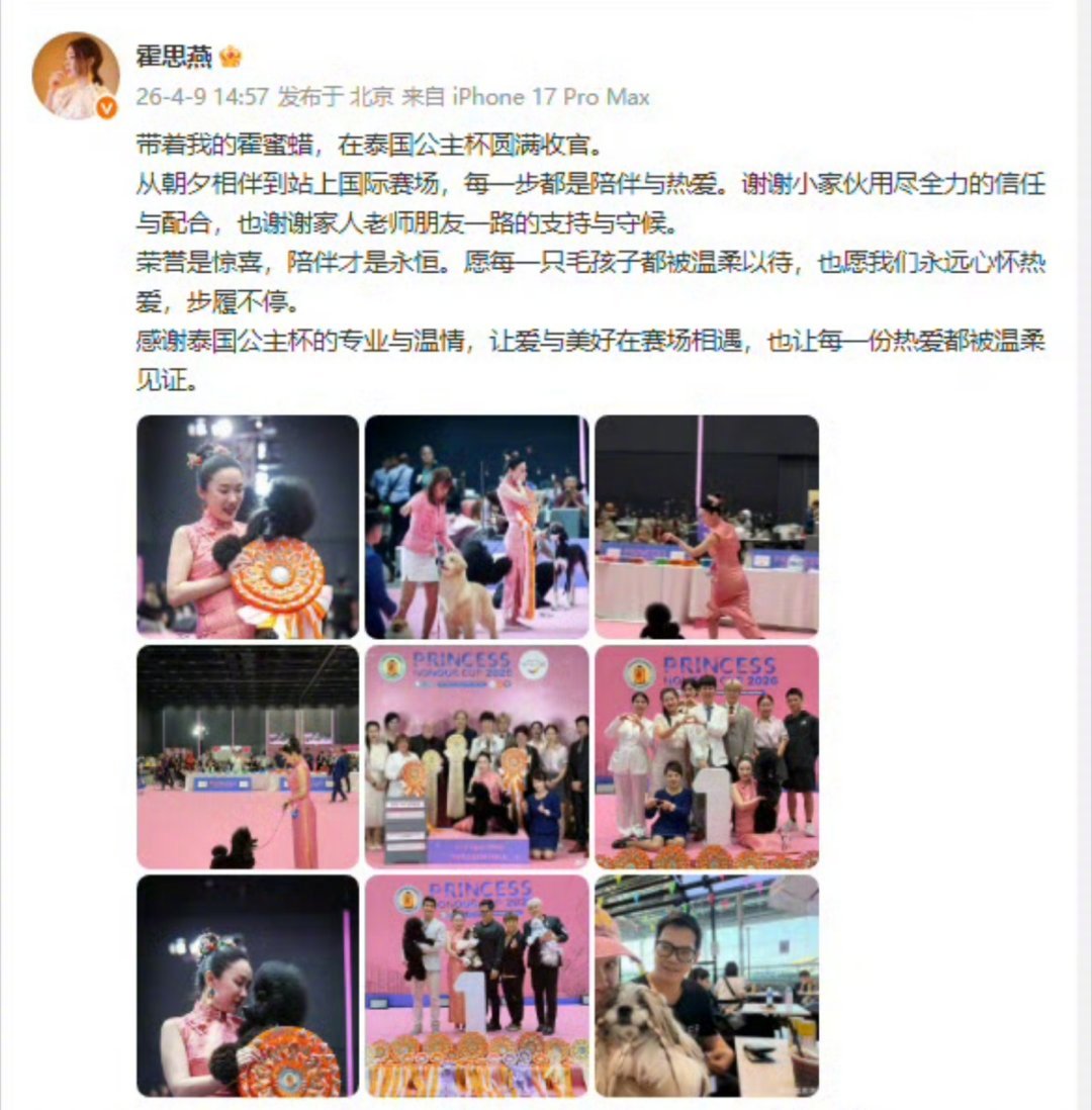 霍思燕回应爱犬在泰国夺冠霍思燕愿每只毛孩子被温柔以待4月9日,霍思燕分享爱犬霍蜜蜡在泰国公主杯夺冠的好消息~从日常相伴到站上国际赛场,满是陪伴与热爱。荣誉是惊喜,陪伴才是永恒,愿每只毛孩子都能被温柔以待❤️~