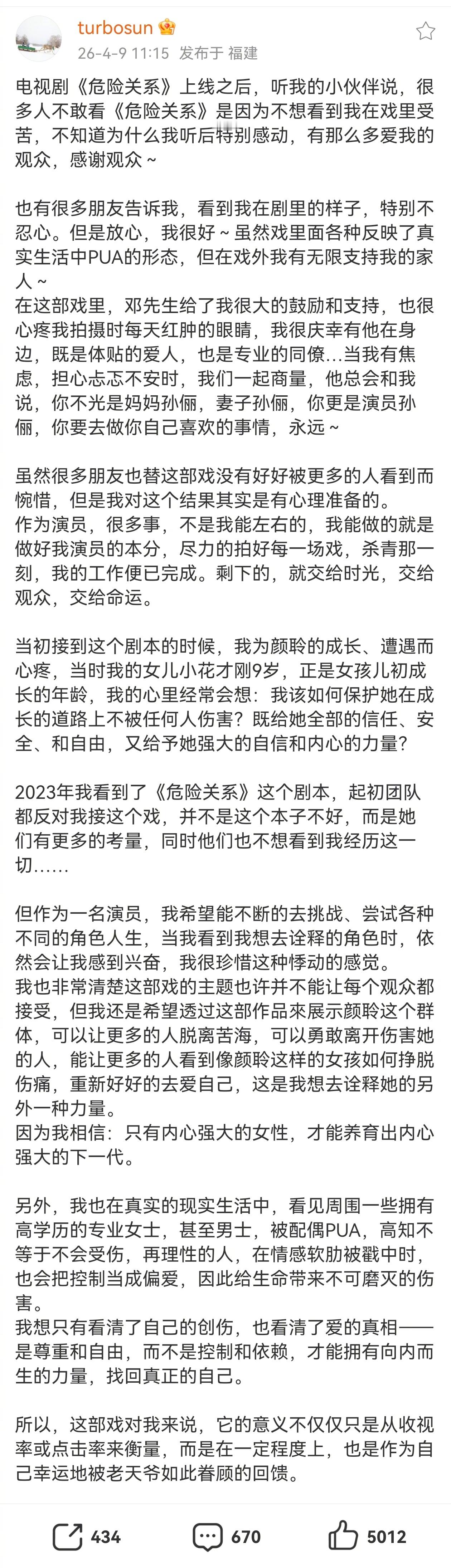 孙俪发长文谈危险关系孙俪回应危险关系收视率不好孙俪发文聊新剧《危险关系》,坦言拍摄期间邓超给予了很多支持与鼓励。对于收视表现,她也坦然回应,称很多事情并非演员能左右,自己早已做好心理准备,能做的就是尽到演员本分,用心拍好每一场戏。