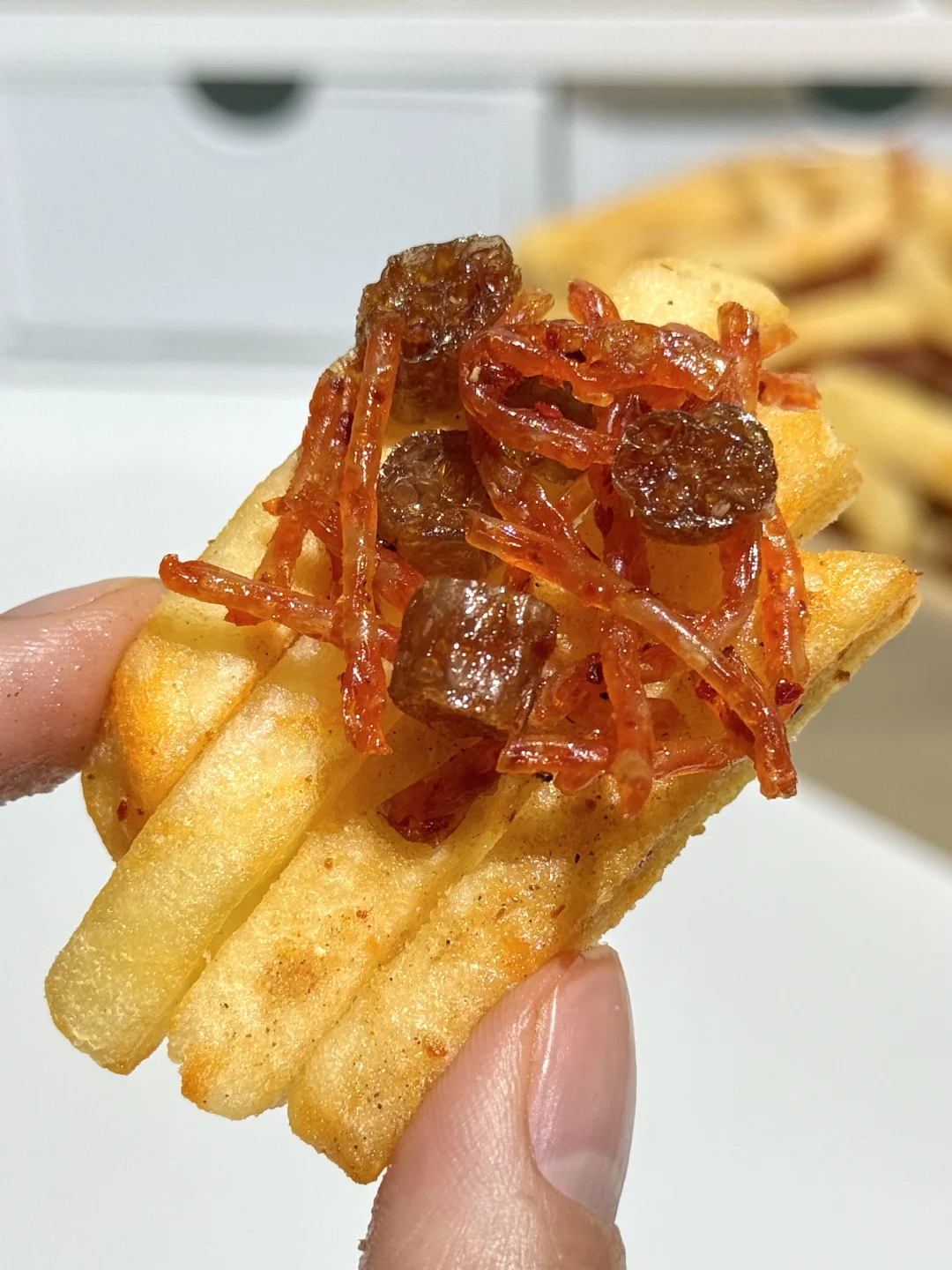 脆升升薯条搭配辣条,一口下去香香辣辣的,口感层次直接拉满!