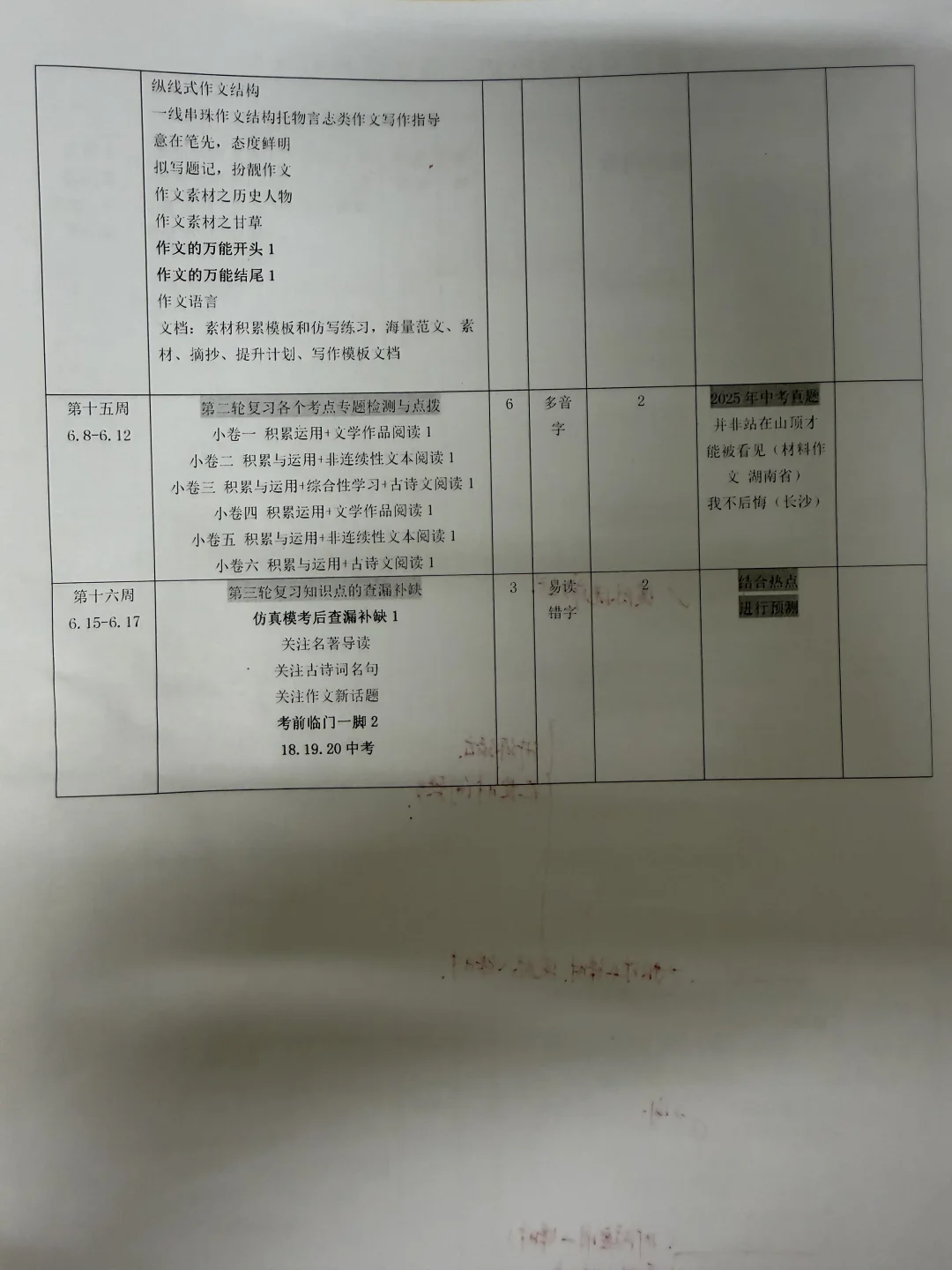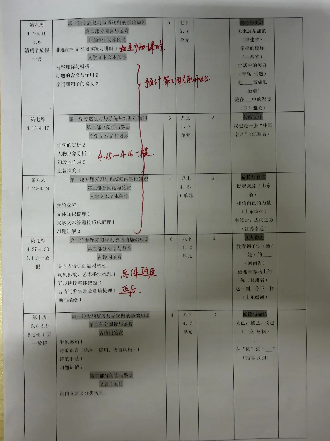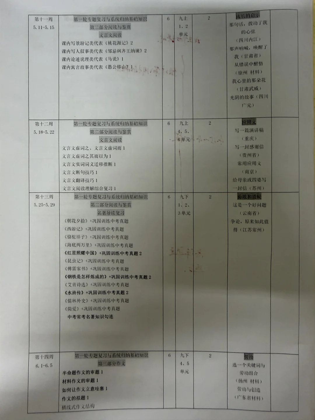 打印出开学制作的初三下语文教学进度复习表一对照,发现计划赶不上变化,这周是第六周,按照原计划应该开始复习非文学文本阅读,但是现在还在进行综合性学习(大意了,因为综合性学习这一块注重课堂练习和讲解,所以耗时多)以下几点需要说明: