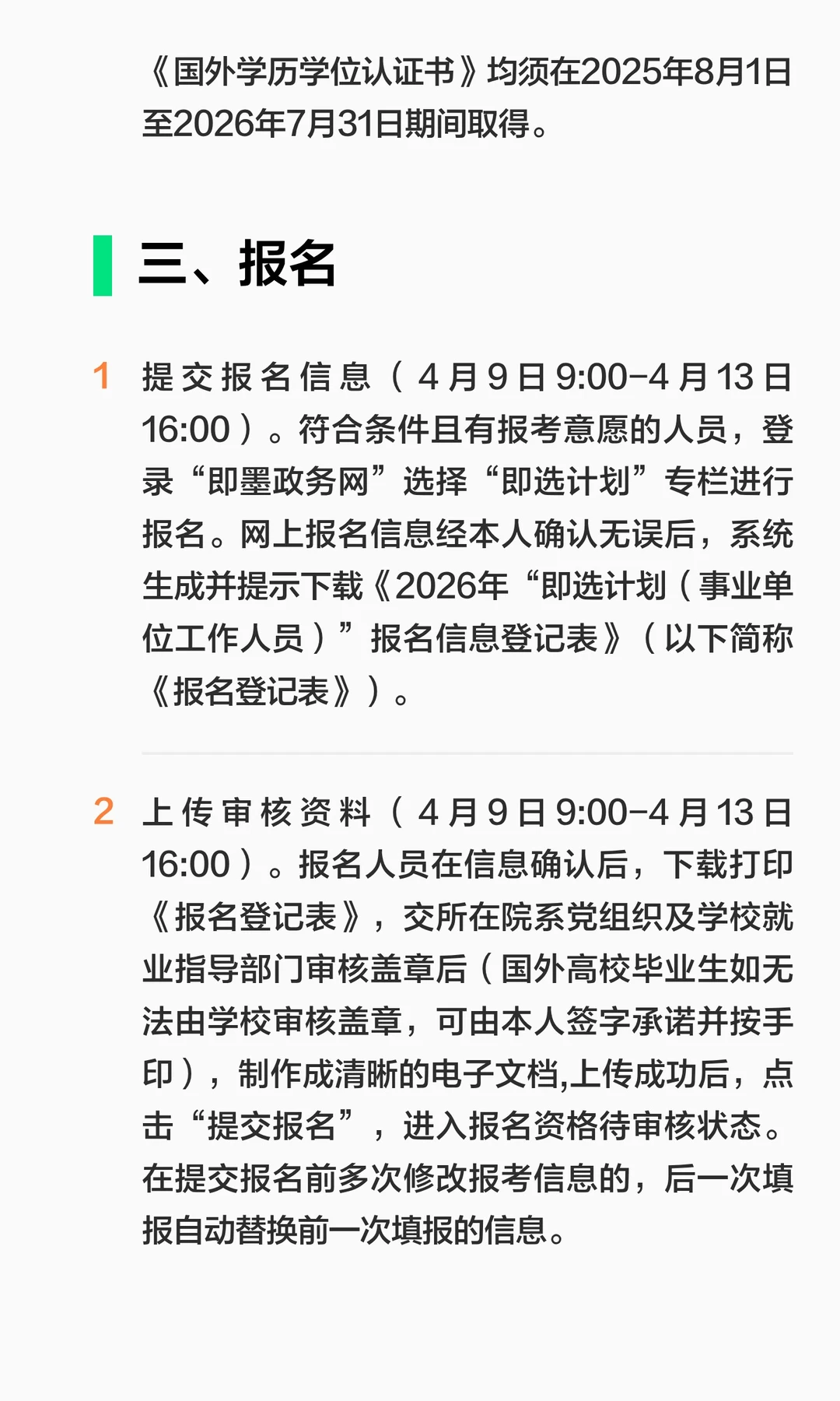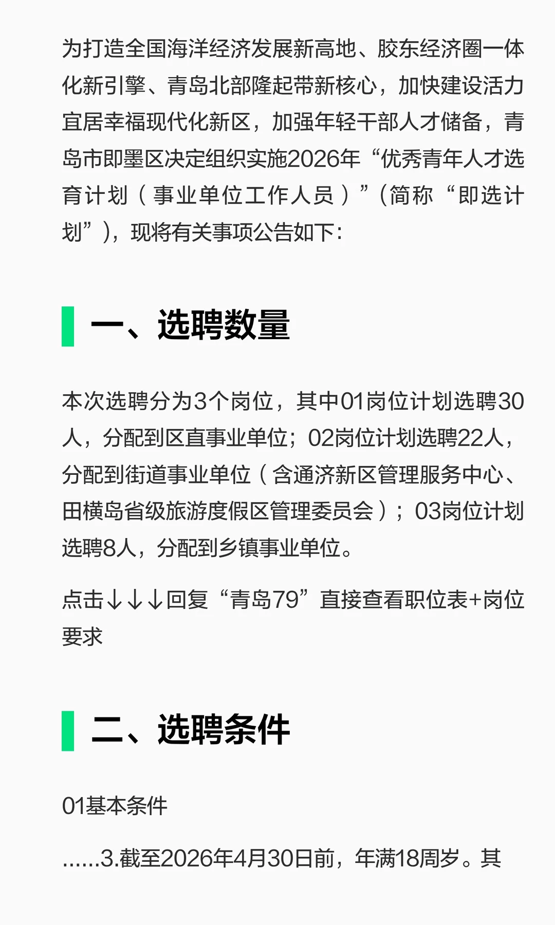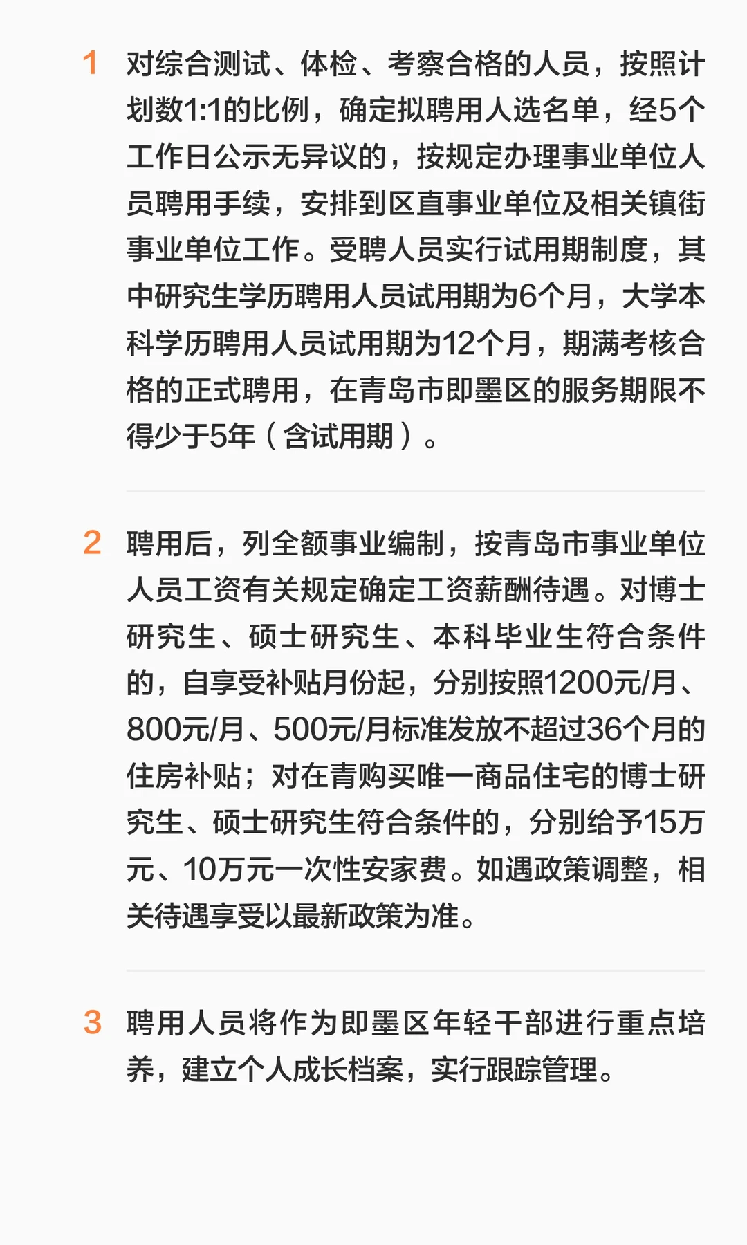 青岛市即墨区2026年“即选计划”选聘面向重点高校应届生,报名4月9日至13日,初选后综合测试,服务期限5年,提供住房补贴和安家费。