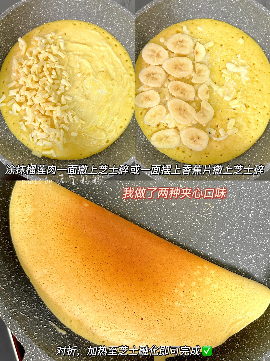 4️⃣一边放上芝士碎,折叠起来煎至芝士融化