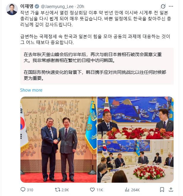 李在明用高规格的接待、毫不吝啬的称赞,清晰地告诉日本政坛:韩国认可和尊重的,是石破茂时期那种尊重历史、管控分歧、谋求互利共赢的对日外交路线,而高市早苗政府的强硬挑衅,只会让韩日关系持续陷入僵局,韩国不会为这样的外交路线提供任何外交礼遇。