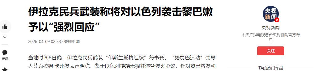 4月9日,伊拉克民兵武装“伊斯兰抵抗组织”的领导人艾克拉姆·卡比放出一句狠话:鉴于以色列持续无视停火协议、针对黎巴嫩发动袭击,他们将予以“强烈回应”,还撂下“以方必将为自己的背信弃义付出代价”这样的硬话。