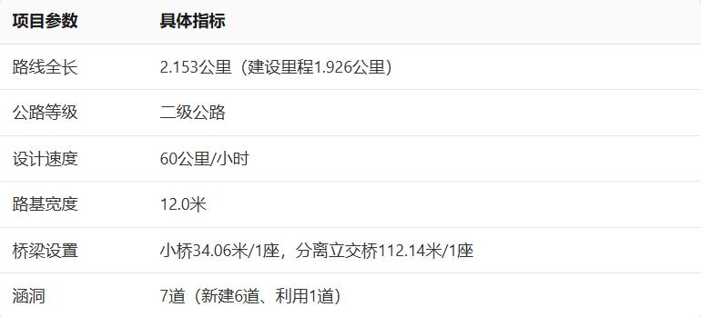 路线全长:2.153公里(建设里程1.926公里);公路等级:二级公路;设计速度:60公里/小时;路基宽度:12.0米;涵洞:7道(新建6道、利用1道)。