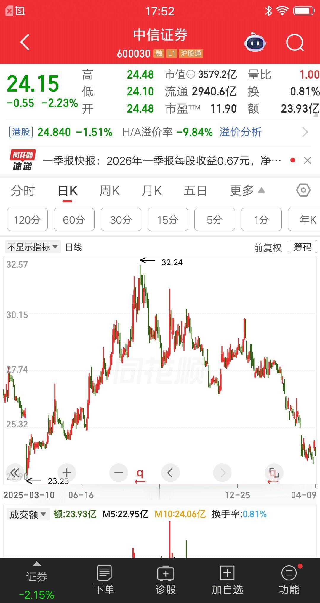 盘后中信证券出了一季报,他的信心又回来了,业绩如此亮眼,反弹行情总该有吧。他决定只要一回本,就果断卖掉。