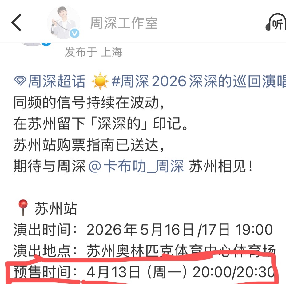 周深苏州演唱会预售时间 4月13日抢票现在就开始紧张了,上两场开票难度猛猛上升,