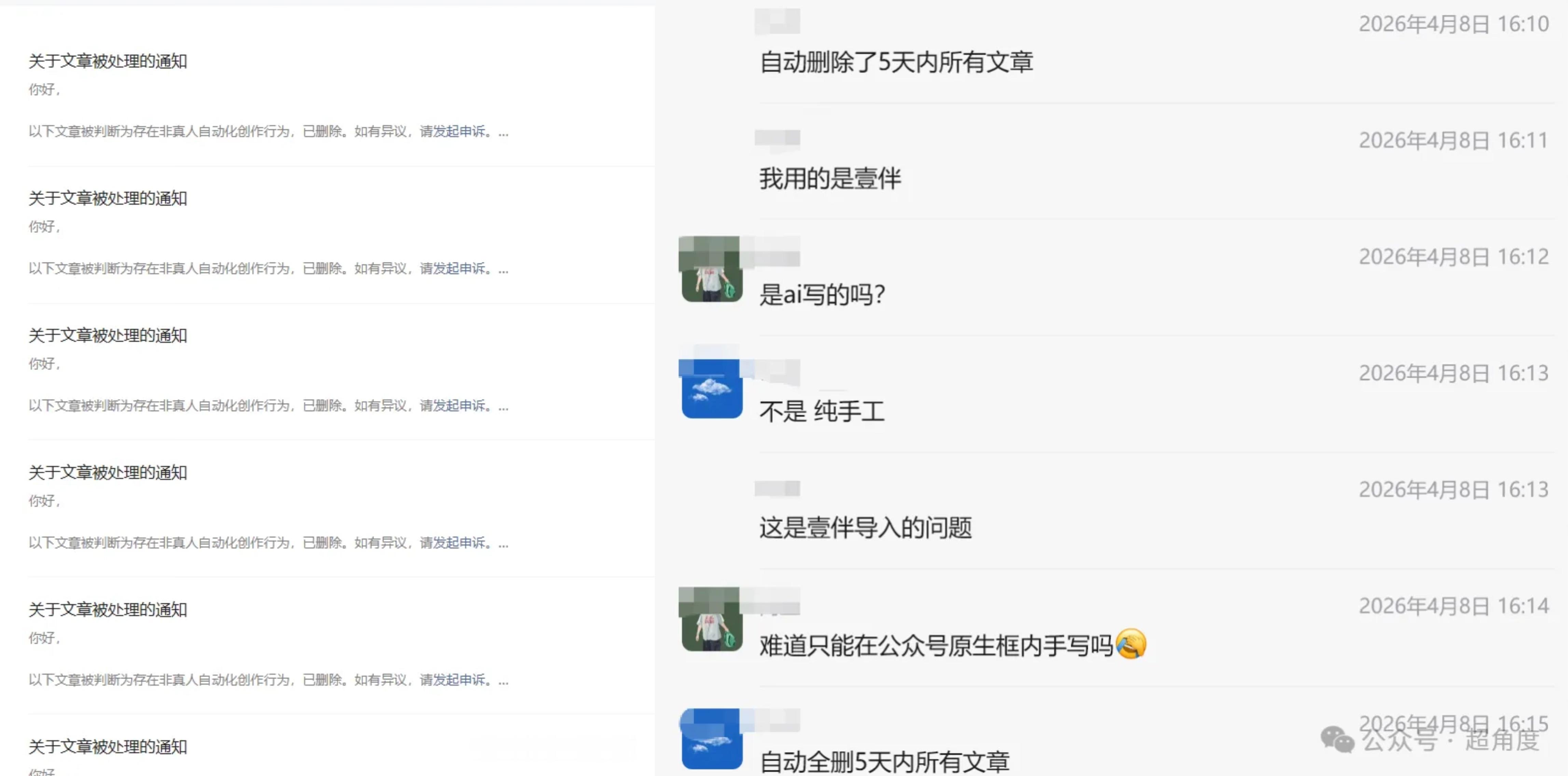 第一批用AI发公众号的人已被封号】微信公众号打击非真人AI创作 不少微信公众号,自己的文章被后台删除,系统提示其内容“存在非真人自动化创作行为”。还有人反映,自己曾利用“OpenClaw”全流程自动化运营公众号,目前账号已被永久封禁。还有用户称,自己发布的AI写作教程也遭到了删除。