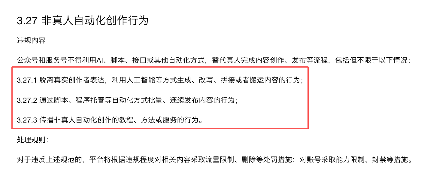 微信公众号近日更新了“非真人自动化创作行为”规则,其中提到:公众号和服务号不得利用 AI、脚本、接口或其他自动化方式,替代真人完成内容创作、发布等流程。