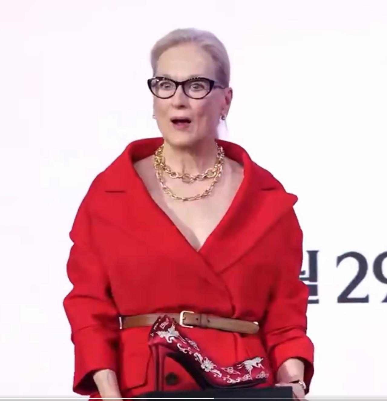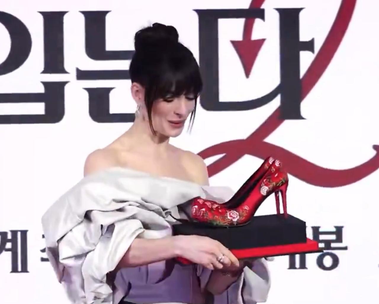 韩国为了宣传本土文化,把一双红色绣花高跟鞋赠送给安妮·海瑟薇,网友直呼看起来好像