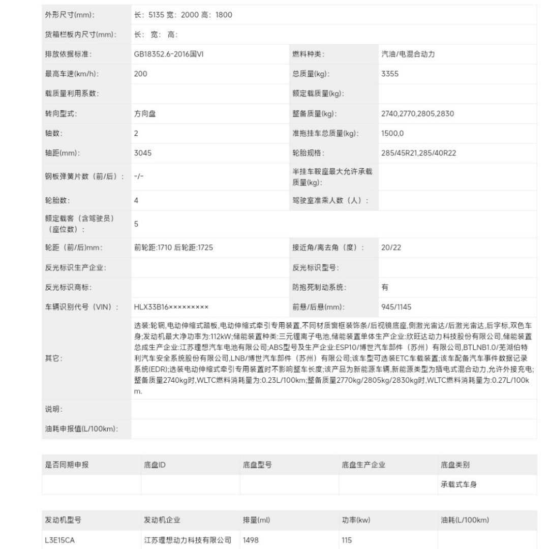理想l8livis登陆工信部长宽高:5135×2000×1800,72.7度大电池!
