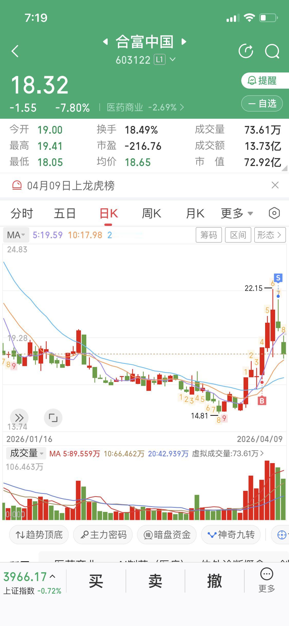 合富中国这只股有点意思。它除了医疗概念,还有海峡两岸概念,这是和其他医药股的不同之处。要是明天下跌不破20日线,我觉得是建仓机会。