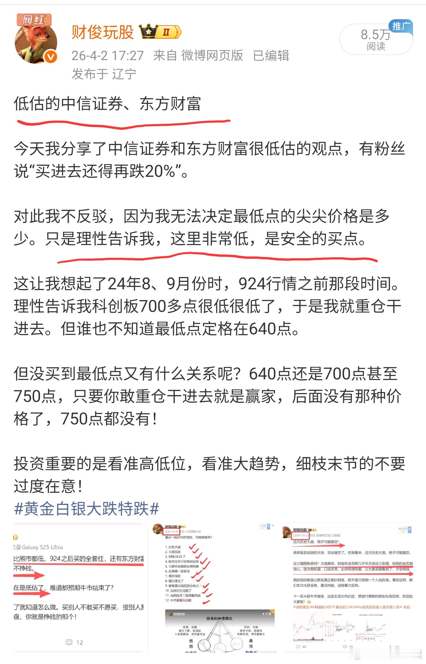 一季报公布,股票严重低估被证实。前几天我说券商到了非常好的买点,不要再往下看了。