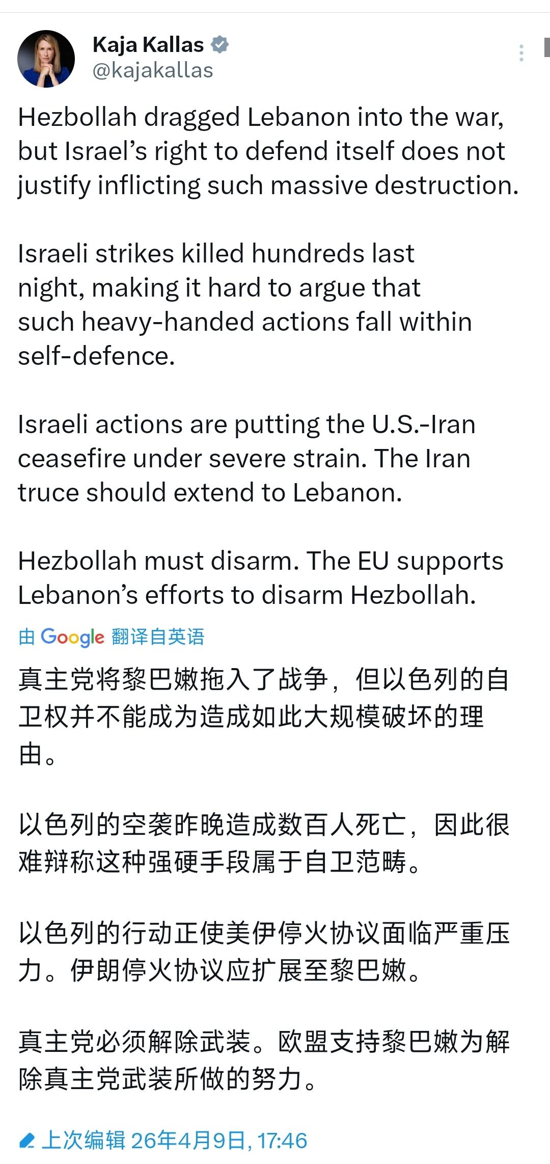 欧盟外交与安全政策高级代表卡拉斯今天(北京时间4月9日)发文写道:“真主党将黎巴嫩拖入了这场战争,但以色列自卫的权利并不能成为造成如此巨大破坏的正当理由。以色列昨晚的空袭造成数百人死亡,这使得很难再辩称这种强硬手段属于自卫行为。