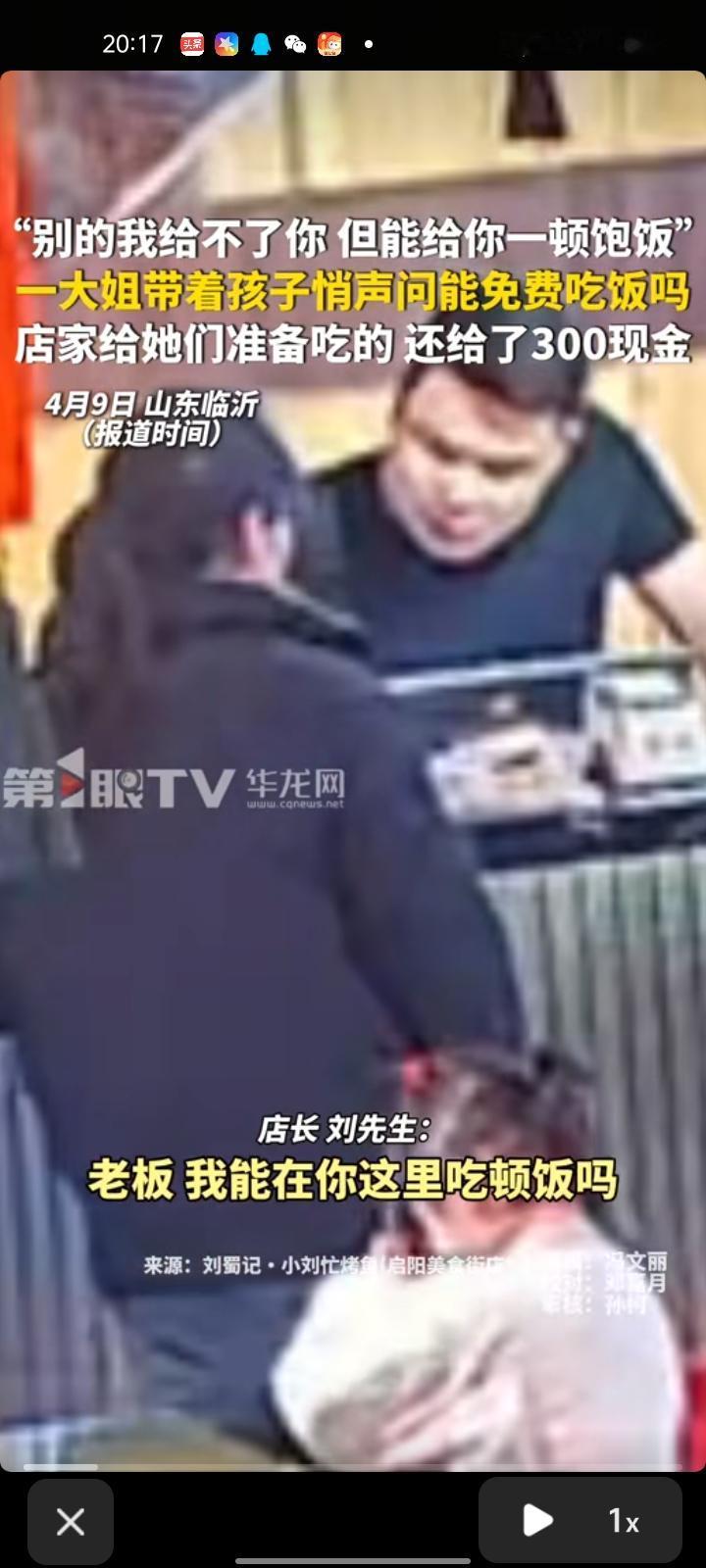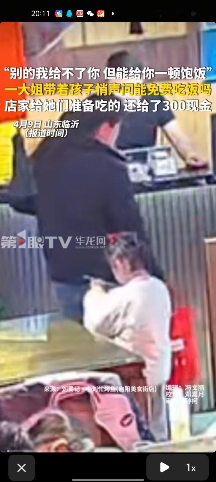 4月7日,山东临沂。店主刘先生称,前两天店里突然来了个大姐,上吧台小声地说:“老板,我能在你这里吃一顿饭吗,带孩子看病没钱吃饭了”,怎么也没想到这个年代居然还有人没钱吃饭。这位大姐一看就是农村人,老实巴交的那种。看着孩子还小,说道:“姐,我给你弄两个菜吃”。