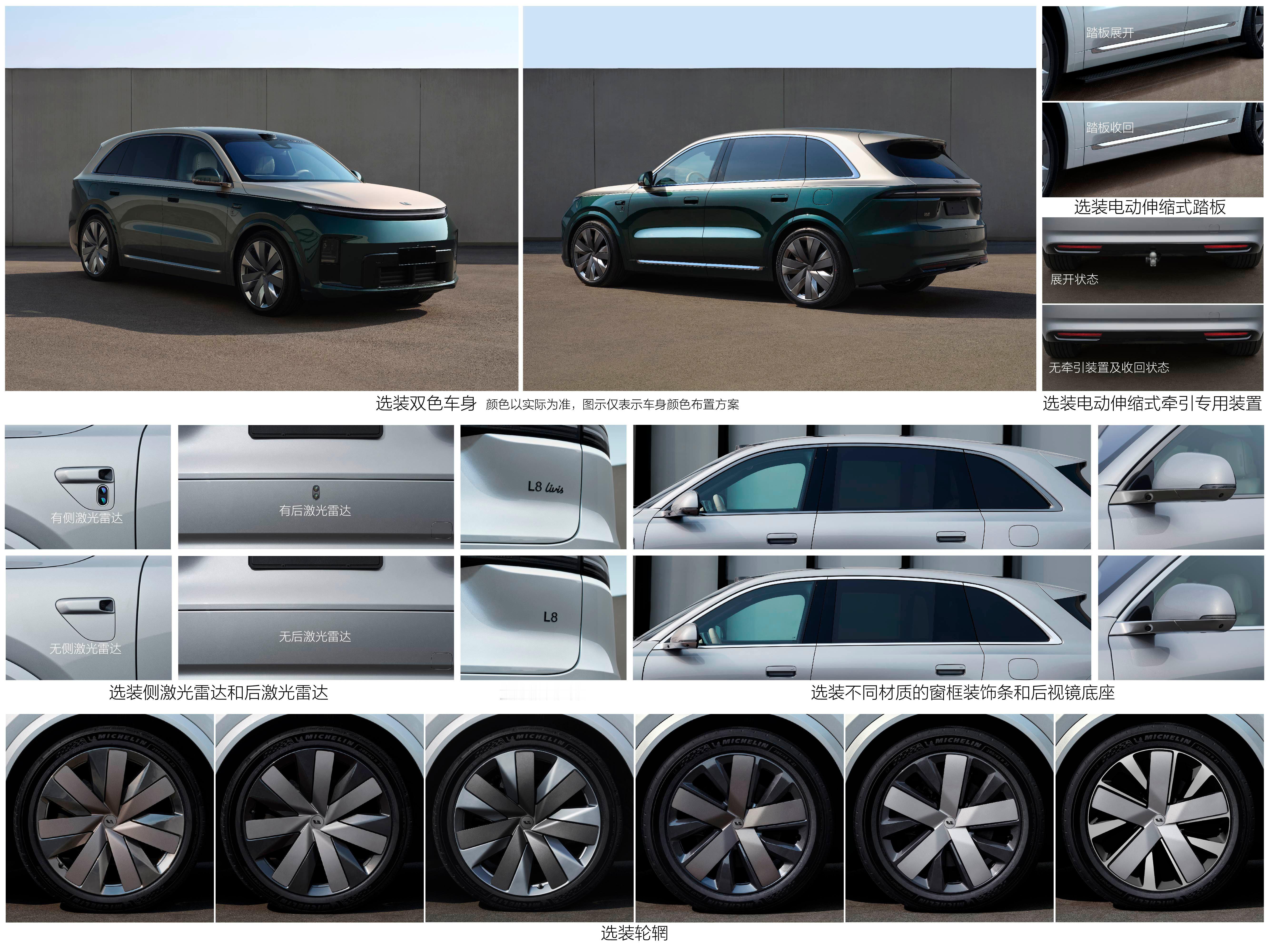 全新理想L8来啦!与L9有很细微的区别,集中在前侧后底部的一些细节设计,尾灯部分区别应该是最明显的。新的双色配色也公开,长:5135 宽:2000 高:1800轴距3045